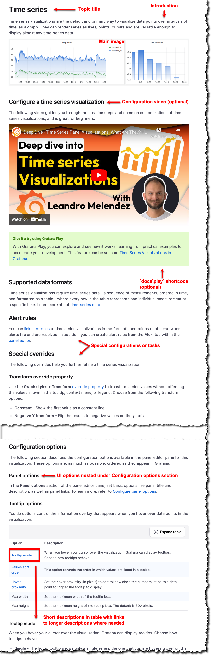 Topic title - A visualization topic title is the same as the name of the visualization as it’s written in the UI (for example, “Time series”). Don’t add the word “panel” or “visualization” to the title.