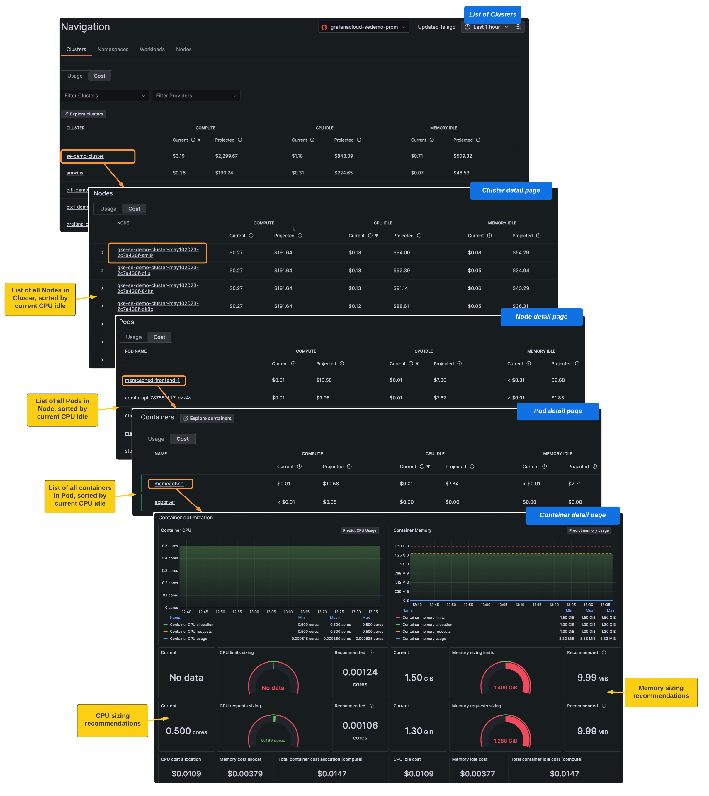 Explore cost information at any level within your Kubernetes infrastructure. In lists of Clusters, Nodes, namespaces, and workloads, you can switch from a usage view to a cost view to see the cost of each item in the list.
