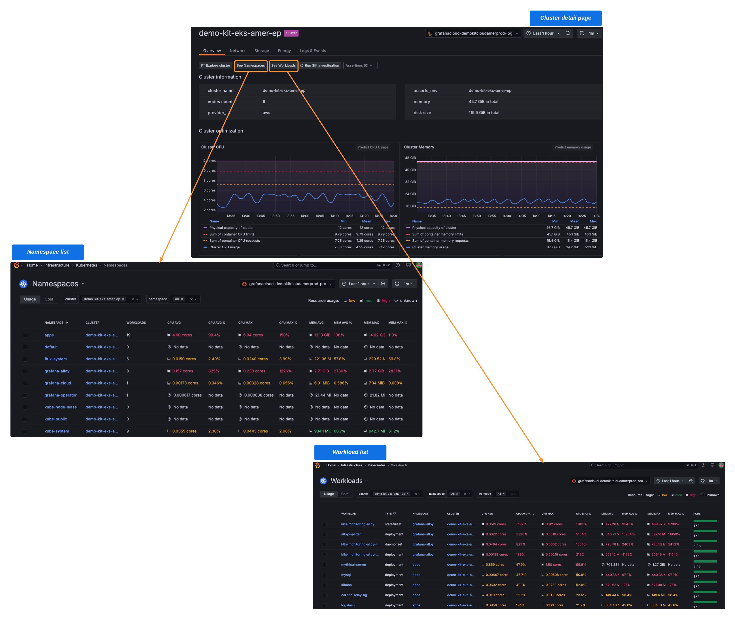 Additional buttons are available on any Cluster detail page for you to immediately access the namespaces and workloads on the Cluster.