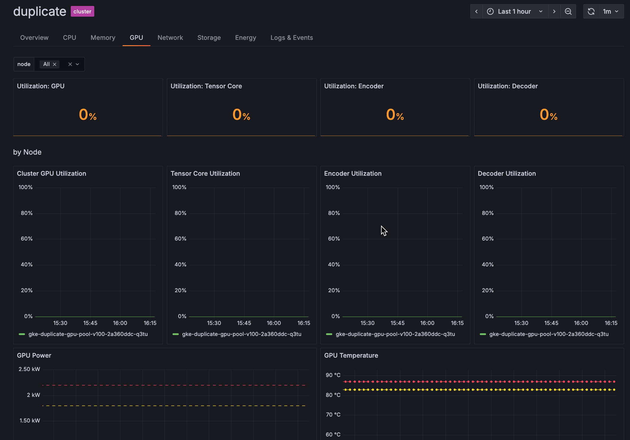 View GPU utilization panels on the GPU tabs of Cluster and Node detail pages to discover whether Nvidia GPUs inside the Cluster are appropriately utilized and whether workloads are getting and using the GPU resources that have been made available.