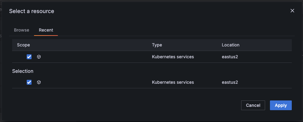 Azure Monitor Resource picker filtering and recent resources