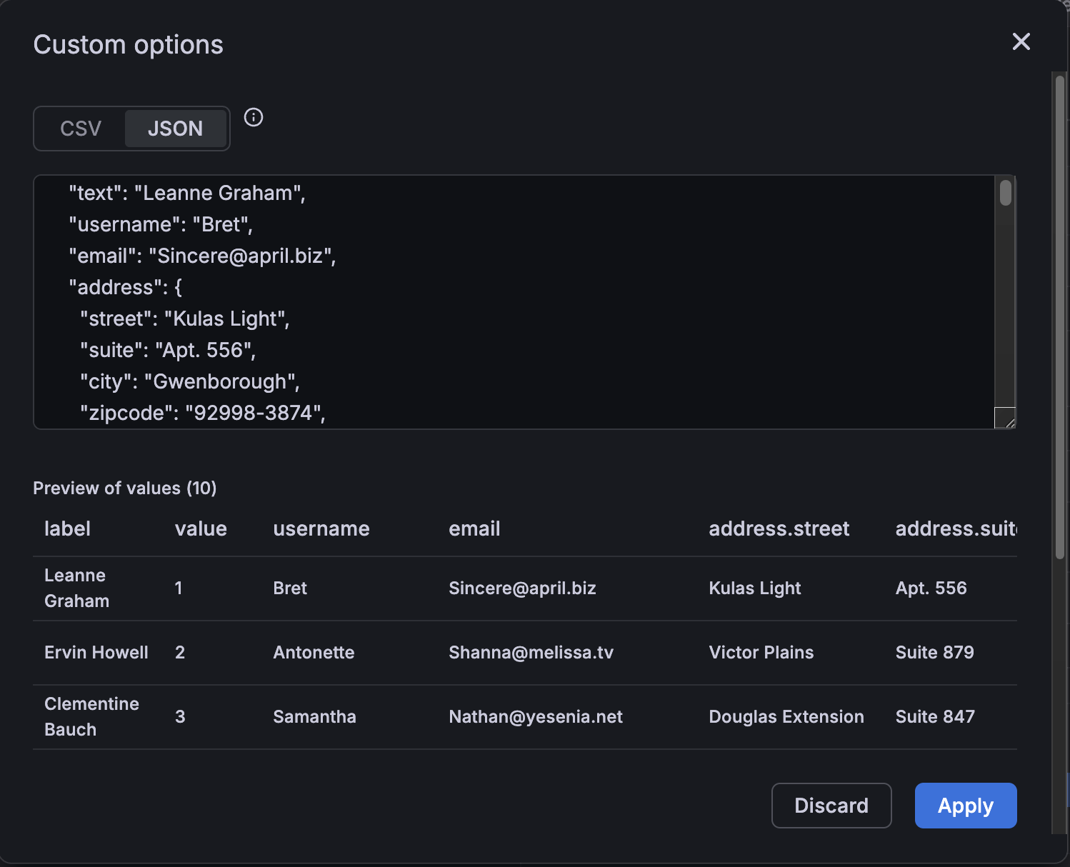 For the custom and query variable types, the editor now also shows a Preview of values table, including the properties, so you can quickly verify property names and values. The preview displays deeply nested properties, and the editor supports autocomplete for property paths.