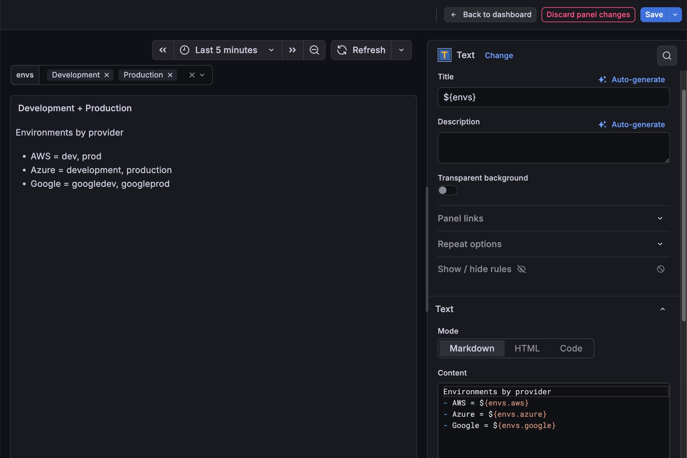 We’re excited to introduce multi-property variables—a simple, powerful way to let you map several identifiers to a single variable. Instead of creating and keeping multiple variables for the same logical concept in sync (for example, an environment identified as “dev” vs “development”), you can map all of those identifiers to one variable and then reference any property you need in panels and queries. This reduces dashboard clutter and makes multi-source dashboards much easier to author and maintain.