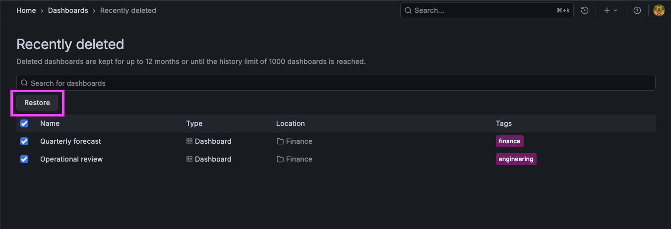 Deleted dashboards are stored for up to 12 months, with space for 1,000 dashboards per org. When that limit is reached, the oldest entries are automatically removed, even if the full retention period hasn’t passed.