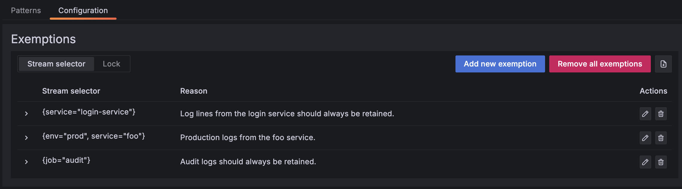 Adaptive Logs introduces support for exempting specified logs from drop recommendations to Grafana, giving you greater control of your data.