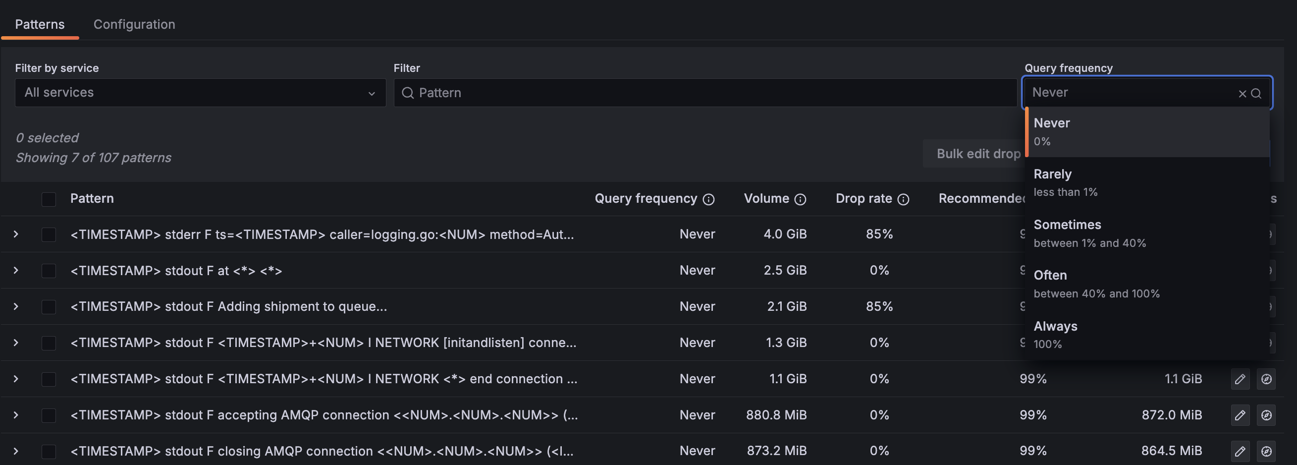 Want to easily stop ingesting your low usage log lines? Adaptive Logs now makes this even easier, allowing you to filter recommendations by how often they are queried. Now, even fewer clicks to apply recommendations for logs which are never queried or rarely queried. This UI enhancement makes it easy to quickly get started with, and get value from, Adaptive Logs.