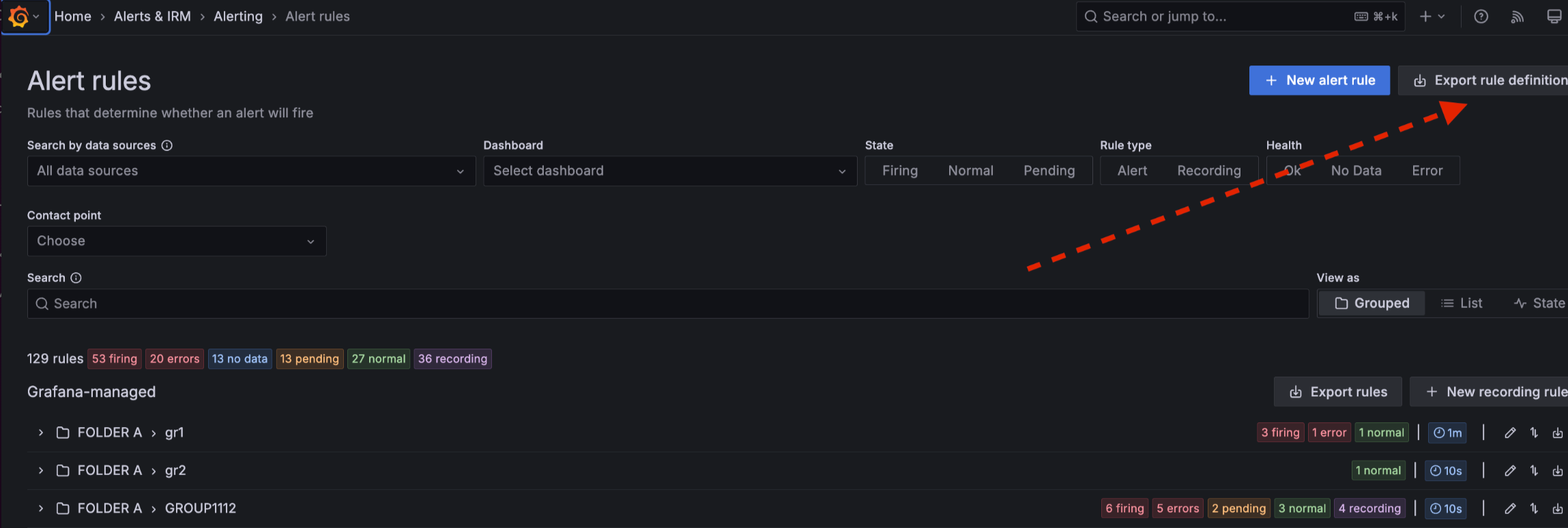 Create a new alert rule definition as part of a provisioned rule group and export it into Terraform (HCL) format. Copy and paste the code into your Terraform pipeline to create your new alert rule. Previously, you had to add the rule definition to the code manually. Now, you can get that code from the UI, enabling you to quickly deploy and manage alert rules as part of your infrastructure as code.