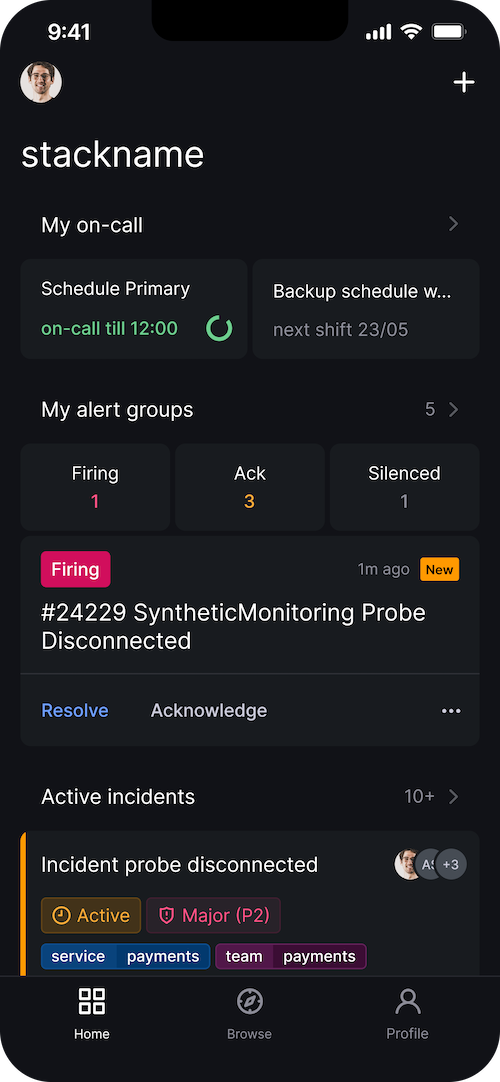 The new home screen is a centralized hub that gives you an at-a-glance overview of everything you need as soon as you open the app. Whether you’re checking your on-call schedule, monitoring active incidents, or managing alert groups, everything is now front and center, making the app more streamlined and efficient for your daily use.