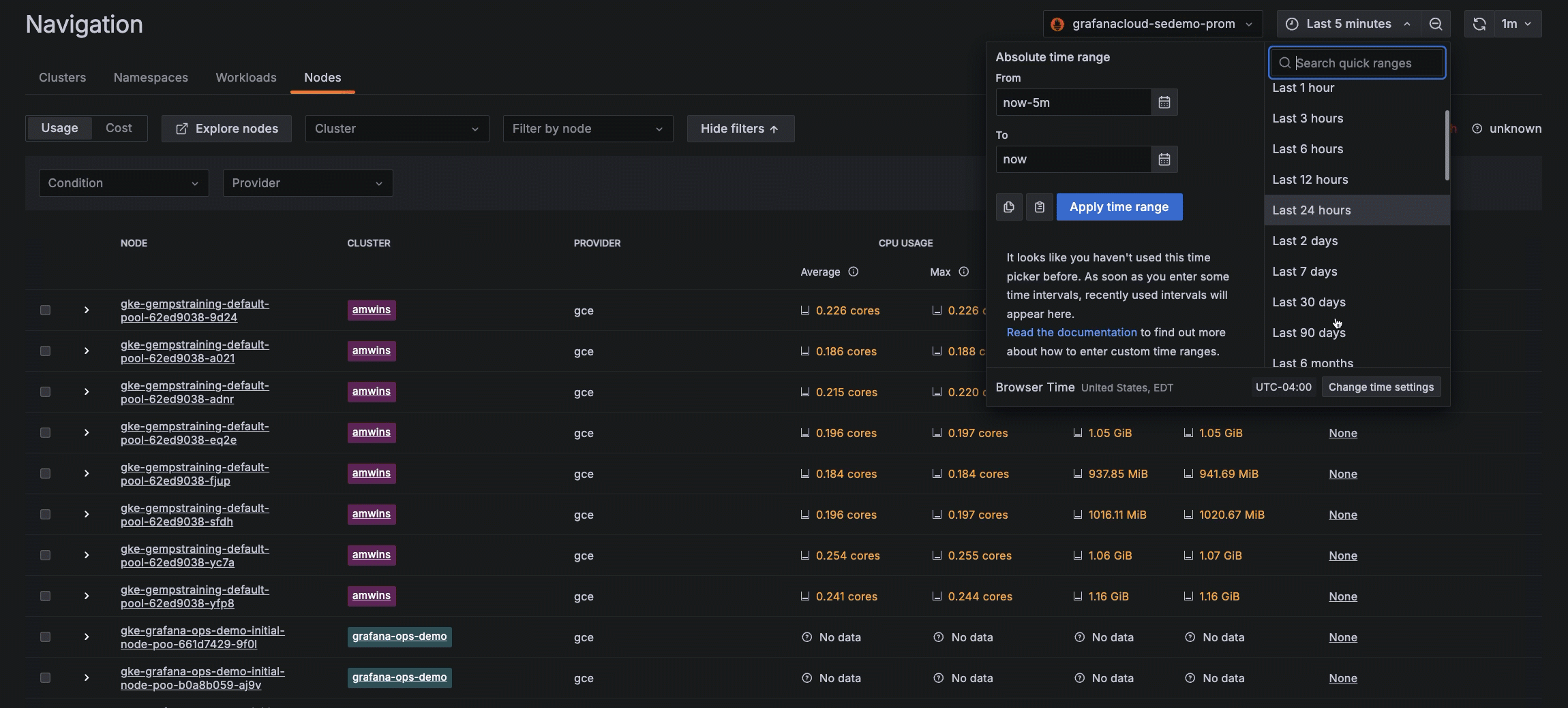 - Find deleted Clusters, Nodes, Pods, containers, workloads, and namespaces