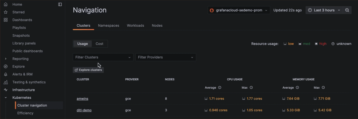 Explore cost information at any level within your Kubernetes infrastructure. In lists of Clusters, Nodes, namespaces, and workloads, you can switch from a usage view to a cost view to see the cost of each item in the list.