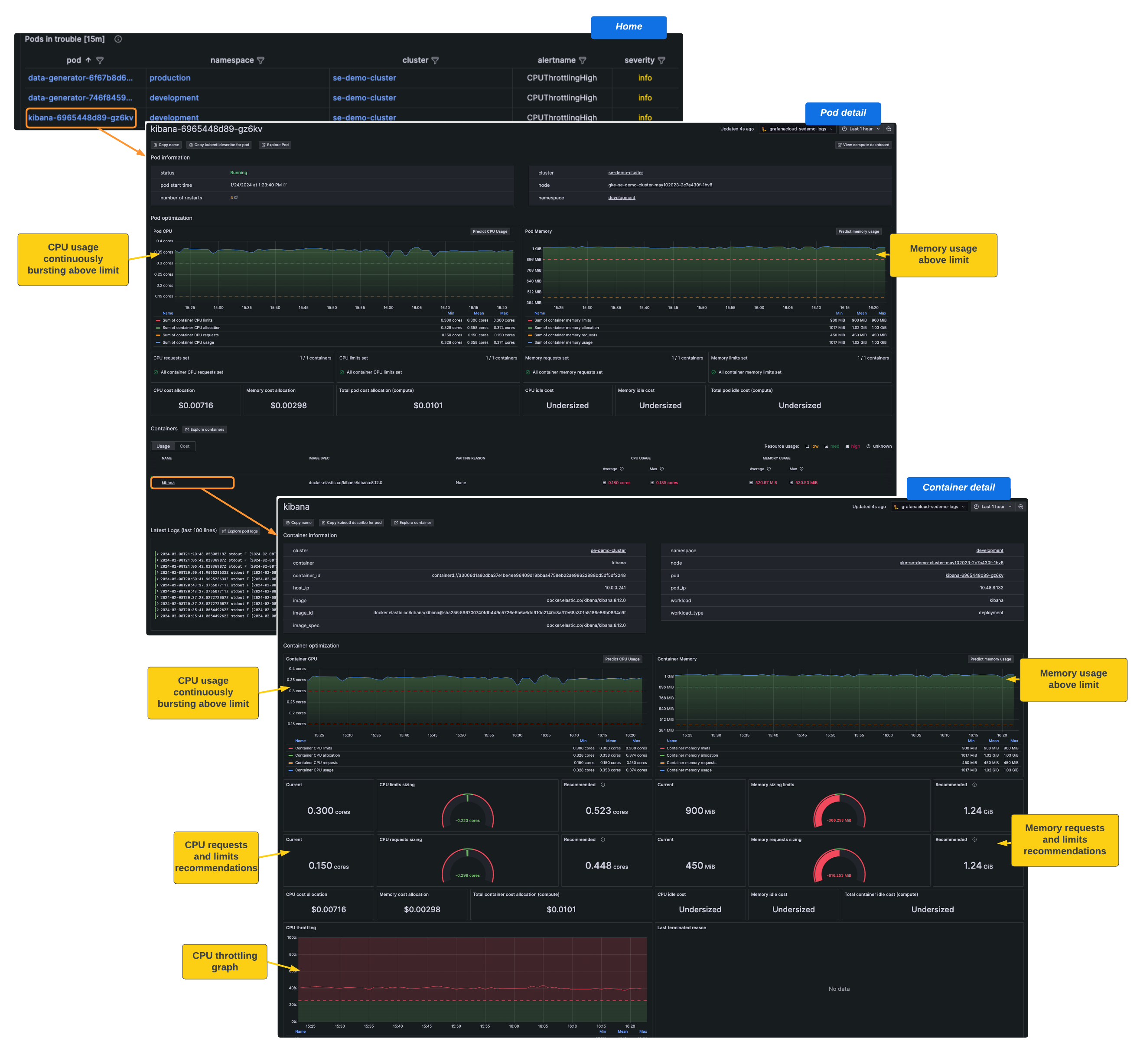 With Kubernetes Monitoring, you can effectively identify, prioritize, and handle efficiency-related issues. Efficiency data is available globally, and your troubleshooting path enables you to create an efficiency feedback loop.