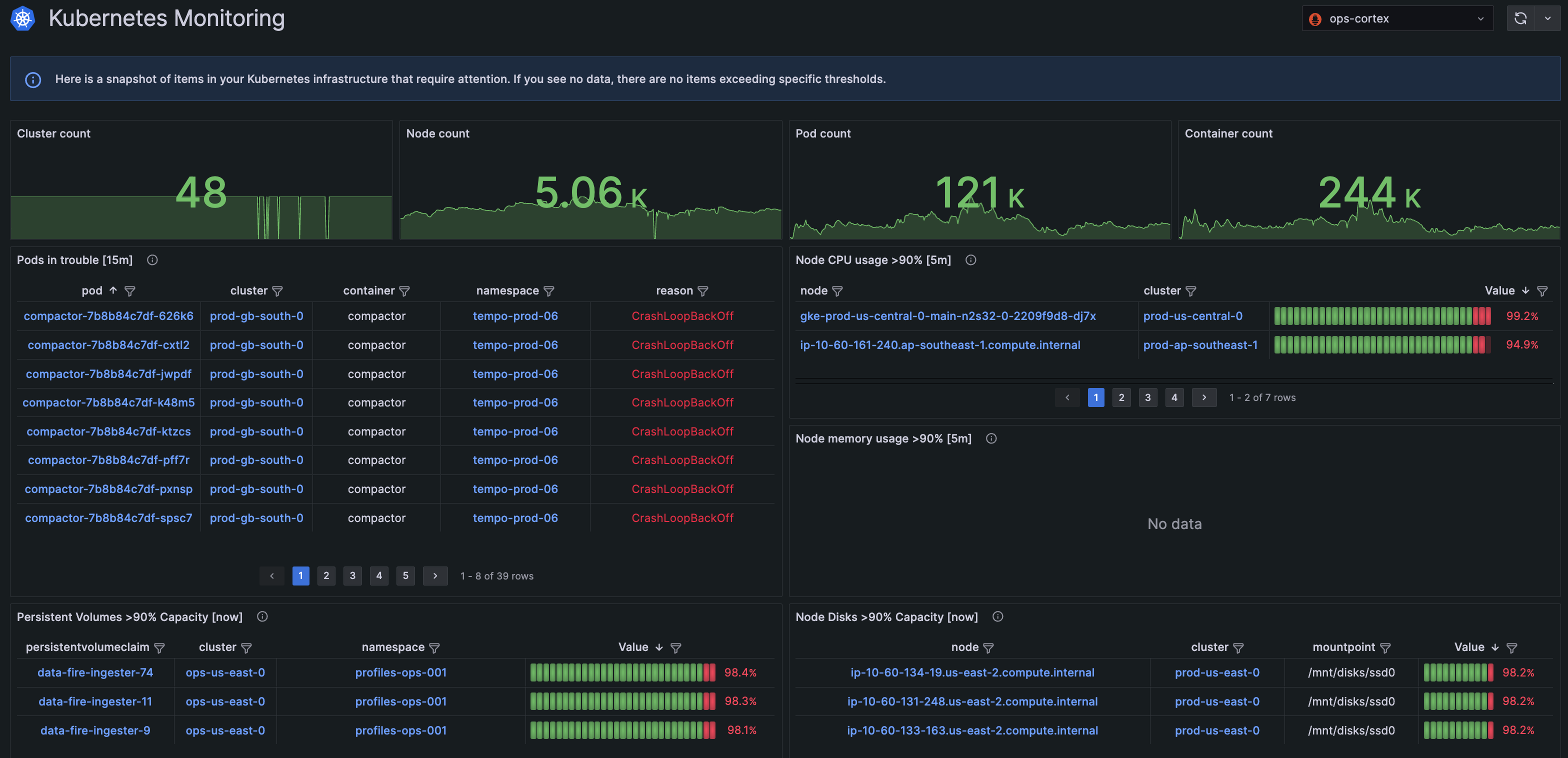 - Node disks with capacity above 90%