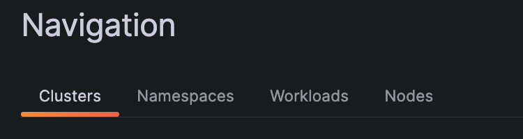 Quickly switch between the Cluster, namespace, workload, and Node views on the Cluster Navigation page using tabs. (Release 1.3.0)
