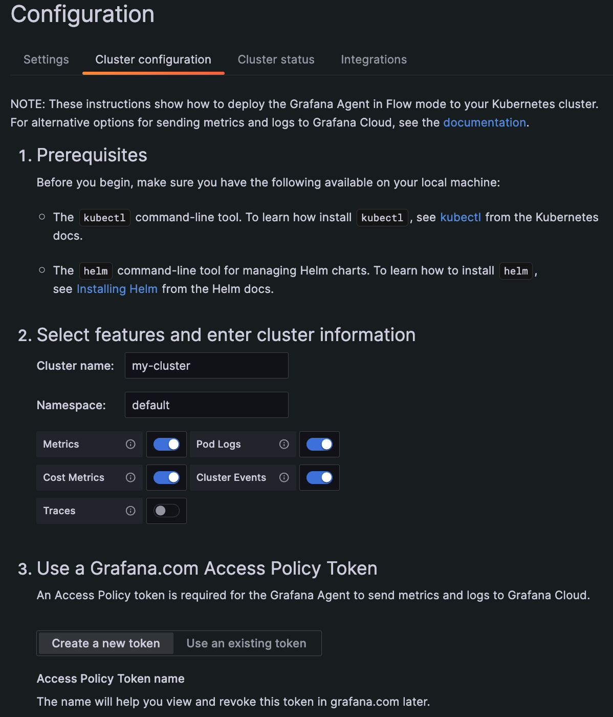 Configure with Grafana Kubernetes Monitoring Helm chart using a streamlined process. With this method, you can set on/off switches to gather metrics, logs, events, traces, and cost metrics. (Release 1.2.0)