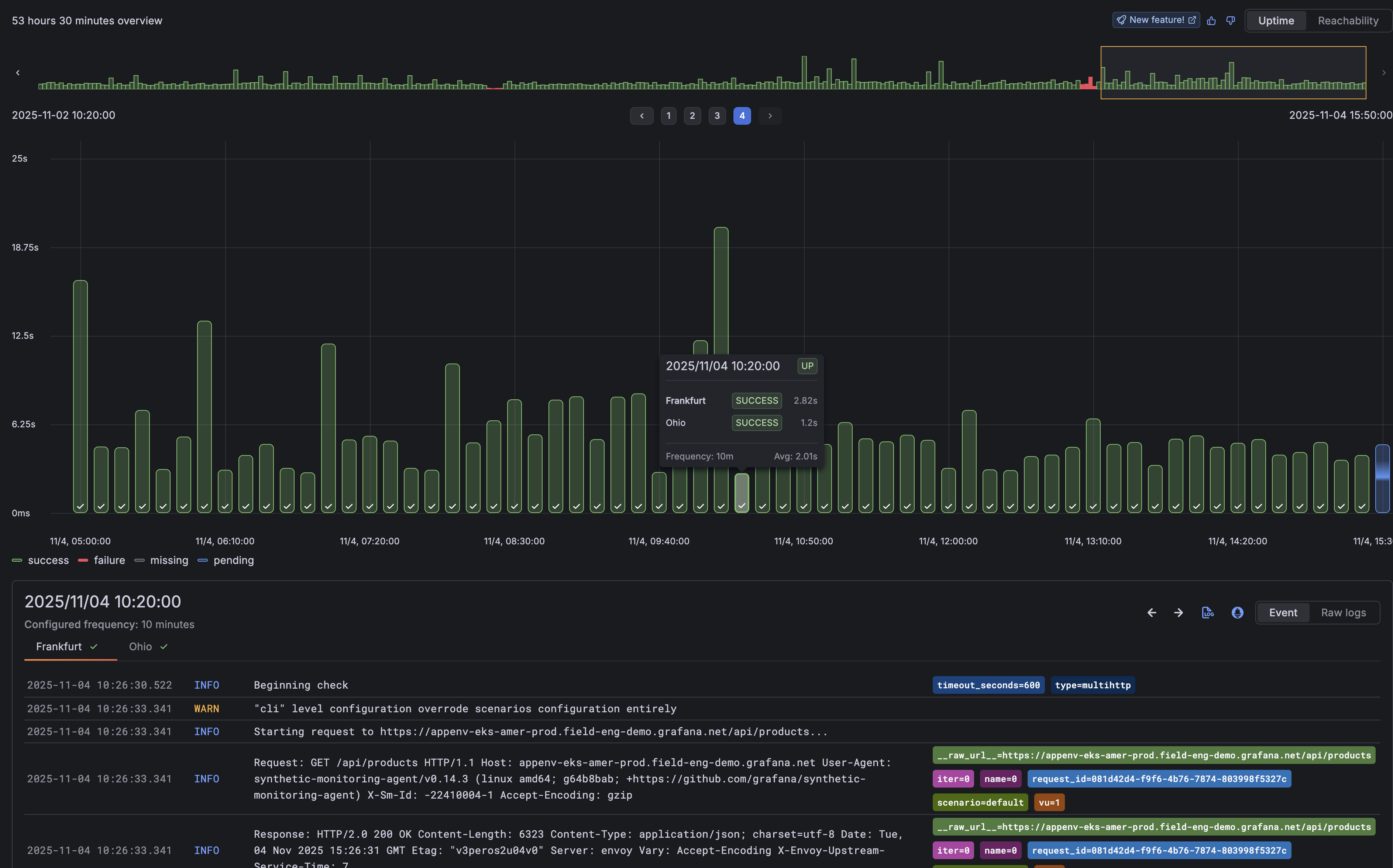 Timepoint Explorer visualizes every check execution as an individual event, turning results into a timeline you can explore. Each timepoint represents a probe execution, allowing you to pinpoint when failures happened and easily view the logs tied to those executions.